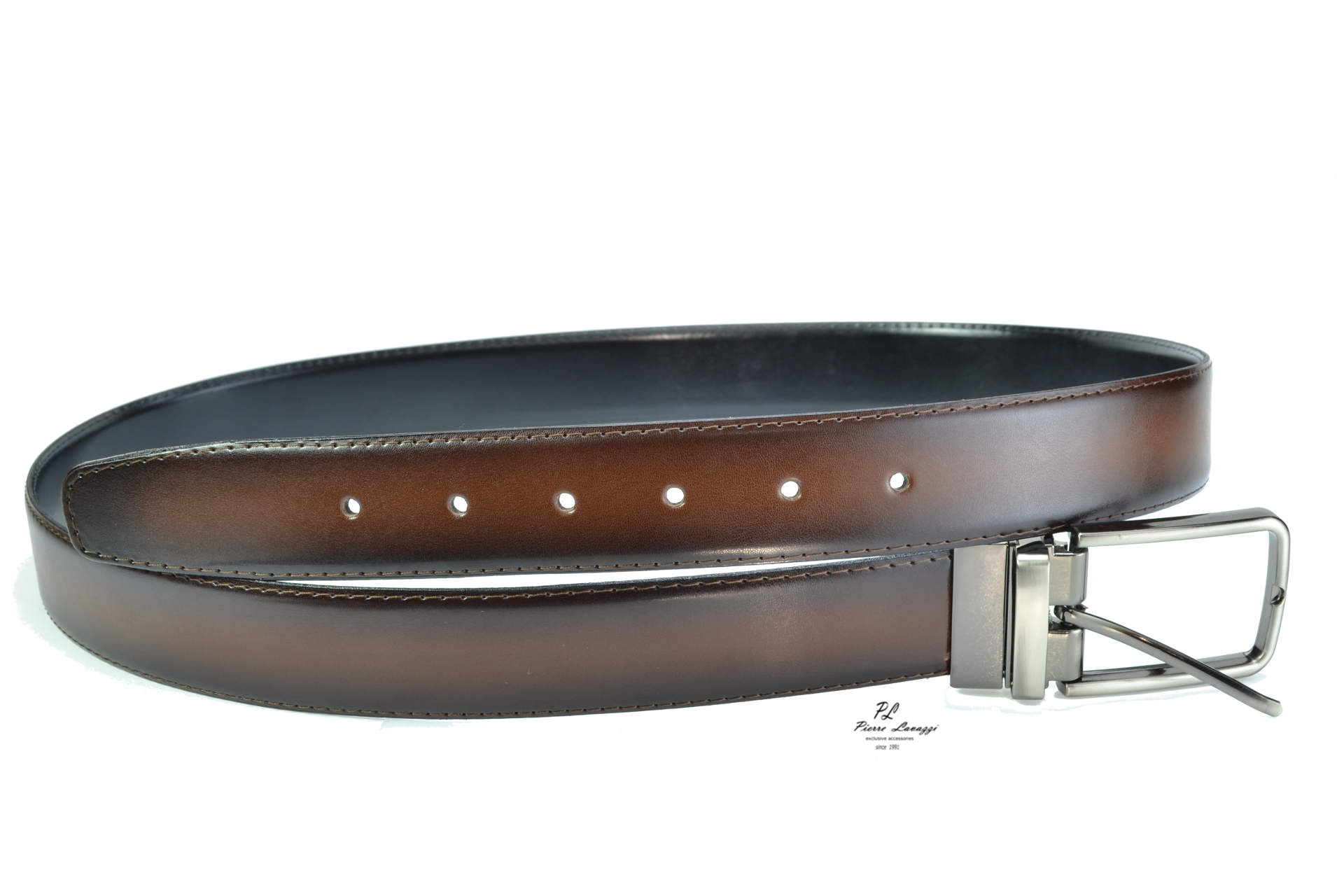 - prešitý elegantný celokožený opasok v šírke 3,5 cm v odtieni tmavohnedom, druhá strana opasku čierna